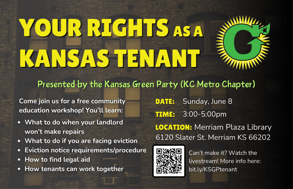 Next month the Kansas Green Party will be hosting a free educational workshop for renters in Kansas to learn how to protect themselves legally when facing issues with their lease or landlord.