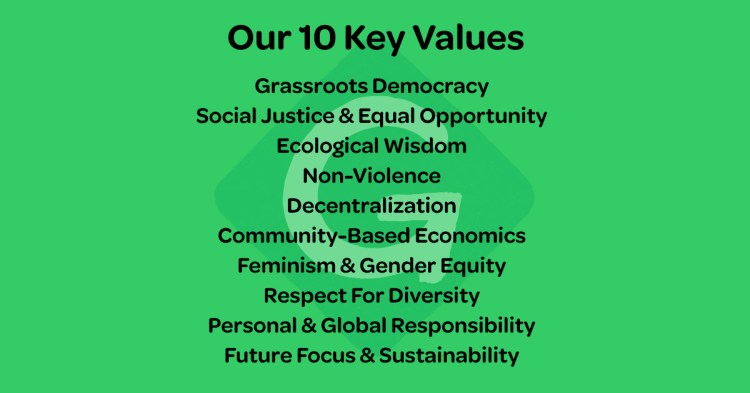 In addition to the Four Pillars of the International Green Party movement, the Kansas Green Party adheres to the Ten Key Values of the Green Party of the United States.
